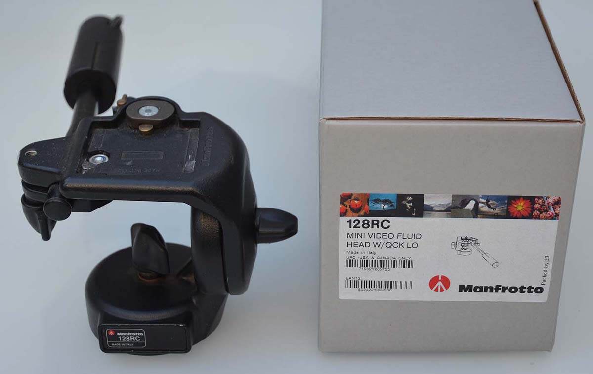 [STb] MANFROTTO Fluid-Videoneigekopf 128RC, schwarz, mit Sicherungshebel. Handgriff gekürzt. Originalverpackung. Dazu: 3 Schnellwechselplatten (nicht abgebildet).